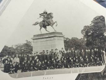 卒業記念写真帖の配布された頃と時期の近い一九三四(昭和九)年に公立中学校二二三校、公立高等女学校二三六校、師範学校四十八校を対象に実施されたアンケート調査では「国体信念ヲ喚起セル根源」のうち「歴史ノ教示」の質問に対し、楠木正成が第一位として挙げられていることが指摘されている(第二位:和気清麻呂、第三位:日露戦争、第四位:元寇、第五位:日清戦争)[ix]。帝国臣民の規範としての「楠木正成」像が青少年の自己に内面化している証左といえる。同学校の修学旅行先、東京においても宮城(皇居)前の楠木正成騎馬像が行程に組み込まれていたことがうかがえる【写真4】。