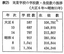 【表】は『学制百年史』より引用した第一次大戦後における実業学校とその生徒の増加数をまとめたものである[iv]。第一次世界大戦が終わった翌年の大正八年から昭和十一年にかけて学校数は約二倍、生徒数は約四倍に膨れ上がっており、実業教育の需要がこの時期に非常に高まったことを示唆している。
