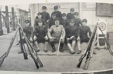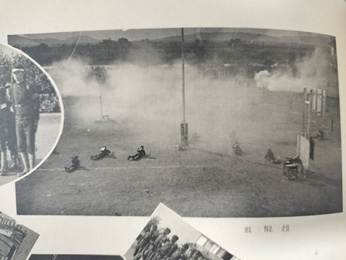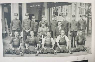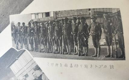 【写真16】には校閲分列式の様子が写されており、その中心には栗本大尉の姿が見られる。【写真17】は運動会の種目の一つに「模擬戦」が存在したことを示している。「鉄カブトを冠り防毒面を付けて」と端書があり、かなり本格的な装備の中、勝敗をかけて実施されていたものと考えられる。【写真18】は部活動のうち、剣道部・射撃部の集合写真に栗本大尉の姿が確認できたため掲載した。この二つの部に関しては配属将校が指導者として配置されていたものと考えられる。現役将校学校配属令に関しては先行研究は多いが、部活動の指導にまで軍人が介入していたことに触れた論考は見当たらなかった。