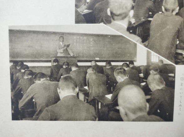まずは、学校生活の最も日常的かつ基本的な活動である学習面について把握していきたい。【写真3】に国語の授業風景を掲載した。黒板には「建武中興論」「神皇正統記」の文字が確認できる。戦前の国語あるいは修史教育の現場ではこのように南北朝時代、とりわけ南朝の重臣たちを「英雄」としてシンボライズし、日本に伝統的な国民性を持つ人物として取り上げられる傾向が強かった。特に楠木正成・正行父子は最もその代表格であり、一般に広く顕彰されていた。