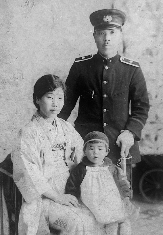 【写真1】一九三三年甘木署比良松で撮影。父・朝吉と母・オサメ。下の子供は弘の姉・富美恵。