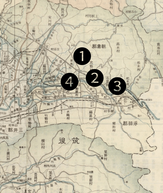 【図2】弘が通った小学校・国民学校の推移。①三奈木尋常小学校②朝倉尋常小学校③久喜宮国民学校④大福国民学校(福岡県統計課「福岡県管内図」(一九四三年)より筆者作成。一九四四年のデータは存在しなかった)。