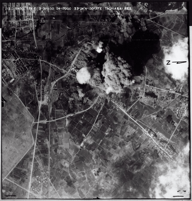 弘が中学校に上がる直前の一九四五(昭和二〇)年三月二七日、この日は終業式であった。大分県・国東半島から侵入したB-二九爆撃機一五〇機が九州北部に来襲し、その一部が陸軍大刀洗飛行場攻撃のため編隊から分岐した。陸軍大刀洗飛行場は「東洋一の航空基地」と呼ばれ、この飛行場から多くの特攻隊員が出撃していた。弘が居た朝倉からは西に五㎞ほどの場所にあった。午前一〇時から鳴り始めた警戒警報は、すぐに空襲警報に変わり、鳴り始めた頃にはB-二九が真上に居た。空襲が始まった時「ドカドカ」と地面が揺れた。この空襲で飛行場は全滅し、立石国民学校の生徒も爆撃に巻き込まれた。この立石国民学校も卒業式中だったが、生徒が走って近くの森に逃げ込んだ。しかし、爆弾がその逃げ込んだ森に落ち、三一人全員が亡くなった[xiii]。また、四日後にも空襲があり、二度の空襲で六〇〇~一〇〇〇名が死亡した。