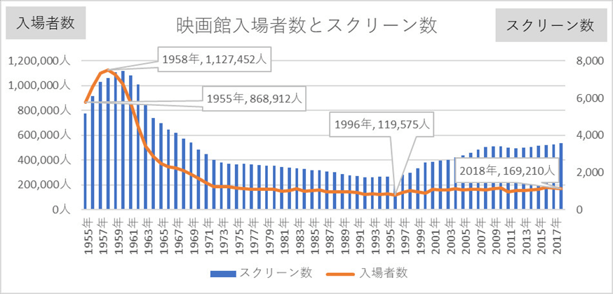 出典:vod流儀「映画館の推移、スクリーン数や入場者数、都道府県別」