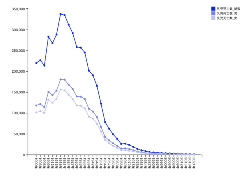 【表】一九〇〇年~二〇二一年までの乳児死亡率の推移。厚生労働省「人口動態調査 人口動態統計 確定数 乳児死亡」より筆者作成。
