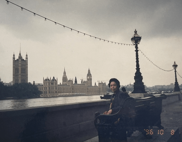【写真】イギリスビックベンを背景に写る妻・洋子。一九九六年一〇月八日撮影。