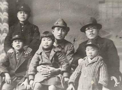【写真2】当時の家族写真。右から父・朝吉で、下が弟の博民。中央に抱きかかえられているのが姉・富美恵で、椅子に腕をかけているのが弘。中央上と左上の人物は不明。