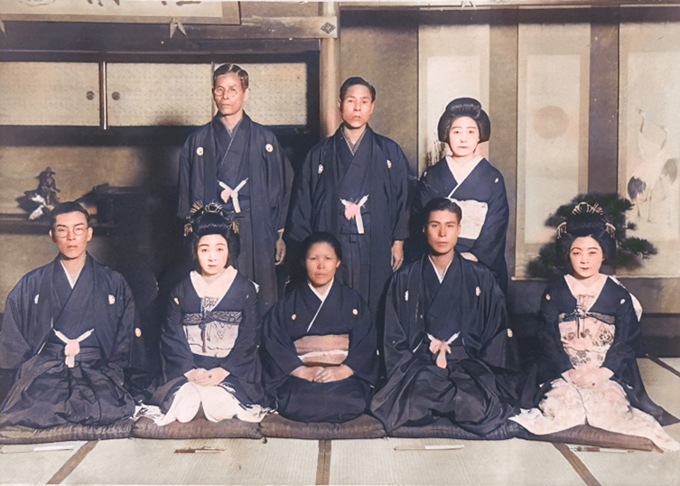 【写真3】一九三七年ごろ大正町にあった自宅で撮影。下段左から反時計回りで、幸次郎、千代乃、トシ、良雄、三枝子、静子、官市、トシの兄。