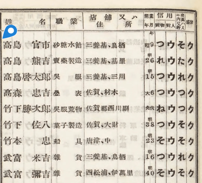 【写真4】官市の名義で載っている。帝国興信所編『帝国信用録』三一版、帝国興信所、一九三八年。 国立国会図書館デジタルコレクション https://dl.ndl.go.jp/pid/1686695 最終閲覧二〇二五年一二月二二日。創業は父・伸市が亡くなった翌年の一九三四(昭和九)年。年商は「そ」で三万円以上五万円以下。対人信用度は「ウ」で普通。
