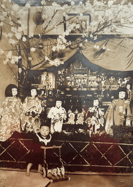 【写真5】一九三八年ごろ自宅で撮影。洋子と、雛壇上部に天皇一家の写真が飾られている。日中戦争以降進められていた締め付けで飾るようになったと思われる。